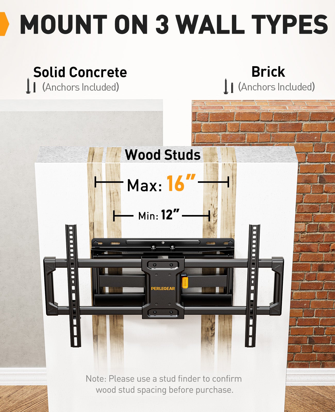 PGLF12  full motion tv wall moun bring your TV closer for viewing using the long 16.5" arm extension or retract the mount back to 2.9" for a low-profile look. Equipped with security locks and anti-drop end caps, this wall mount bracket holds your TV securely in place for peace of mind at all times.